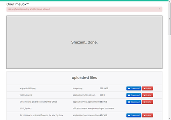 アカウント不要だから送信が速い「ファイルをアップロードして、URLを送るだけ」とOneTimeBoxの使い方はとても簡単です。まずはサイトのトップページ中央にある「Create your box」ボタンをクリック。次に表示される「drop yo‘ files here」(「ファイルを落としちゃいなよ!」、といった意味)部分に共有したいファイルをドラッグ&ドロップで入れていきます。ドロップすると自動的にファイルのアップロードが始まり「Shazam, done. 」(「じゃじゃーん、出来上がり!」、といった意味)と表示されるとアップロード完了です。アップロード可能な容量についてサイトでは明記されていませんがソフトニックでのテストでは300MB以上のファイルでも3分ほどでア比較的早く アップロードできました。アップロードのスピードはDropboxなどの有名サービスと比較しても遜色のないものだと言えるでしょう。ました。